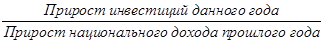 Мультипликатор (МР) = В свою очередь, рост ВВП вызывает увеличение национального дохода, что расширяет возможности последующего увеличения инвестиций. Данное обстоятельство приводит к возникновению в экономике акселерационного эффекта. Чтобы оценить его проявление, применяется акселератор инвестиций. Акселераторинвестиций (от лат. accelero – ускоритель) – это коэффициент, показывающий зависимость прироста инвестиций данного года от прироста национального дохода прошлого года. Он определяется по следующей формуле: