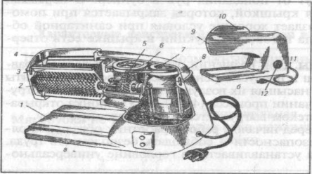 а - разрез: 1 - основание; 2 - ножи-фрезы; 3 - гребенка; 4 - крышка; 5 - редуктор; 6 - клиноременная передача; 7 - червячный редуктор; 8 - электродвигатель; б - общий вид: 9 - корпус; 10 - загрузочная воронка; 11 - шнур с вилкой; 12 - кнопки управления