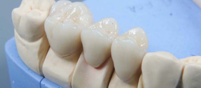 Готовый металлокерамический мостовидный протез, на разборной модели.