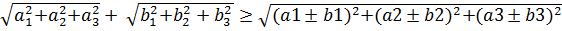 Формула (6.1) обобщается на случай суммы (или разности) трех и более векторов. Геометрический смысл (6.1) состоит в том, что длина ломанной линии, соединяющей две точки трехмерного пространства, больше или равна длине отрезка прямой, проведенного между этими точками. Формула (6.1) иначе называется неравенством треугольника. Следует особо отметить, что равенство в (6.1) достигает тогда и только тогда, когда векторы Причем равенство В свою очередь, равенство Скалярным произведением