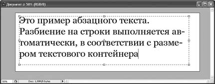 Рис. 1.2. Абзацний текст у вікні документа В процесі роботи можна перетворити текст одного типу в інший. При роботі з точковим текстом доступна команда Layer > Type > Convert to Paragraph Text (Шар > Текстовий > Перетворити в абзацний текст), яка перетворює точковий абзацний текст. Точно так само при роботі з абзацним текстом на місці цієї команди на екрані команду Layer > Type > Convert to Point Text (Шар > Текстовий > Перетворити на точковий текст), яка допоможе перетворити абзацний текст у точковий. Зрозуміло, що всі налаштування, які не існують в новому вигляді тексту (наприклад, абзацні відступи), будуть видалені. Обидва види тексту в результаті створюють спеціальний текстовий шар, в якому інформація зберігається в непиксельном вигляді – текст залишається редагування, якість відображення тексту не погіршується при зміні розміру (адже немає змінення роздільної здатності), але, правда, на цьому шарі можна малювати, до нього не можна застосовувати ефекти, фільтри і команди корекції і т. д. Текстовий шар можна перетворити в растровий командою Layer > Rasterize > Type (Шар > Растеризовать > Текст). Після цієї операції з шаром можна буде працювати як зі звичайним шаром Photoshop – малювати на ньому, обробляти командами корекції і фільтрами; проте водночас ми втратимо можливість редагування тексту, не зможемо безболісно змінювати його розмір і т. д. Тому рекомендується при растеризації текстових шарів залишати запасну, нерастеризованную копію. Для роботи з текстом у програмі Adobe Photoshop існує чотири інструменти: • Horizontal Type (Горизонтальний текст) – призначений для створення текстових шарів з горизонтально, рядками тексту (як то прийнято в більшості мов) (рис. 1.3); • Vertical Type (Вертикальний текст) – призначений для створення вертикальних рядків тексту (як то прийнято в деяких східних мовах); нагадаємо, що Adobe Photoshop – програма багатомовними і в рівній мірі орієнтована на потреби європейських дизайнерів, так і, скажімо, китайських; • Horizontal Type Mask (Горизонтальне текстове виділення) – призначений для створення виділення у формі горизонтального рядка тексту (див. рис. 1.3), який потім можна використовувати з командами заливки і отримати напис поверх растрового шару або задіяти іншим чином; • Vertical Type Mask (Вертикальне текстове виділення) – призначений для створення виділення у формі вертикального рядка тексту.