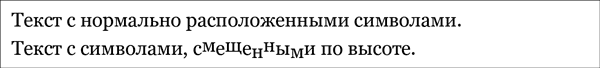 Рис. 1.11. Спотворення ширини символів Зсув символів щодо базової лінії застосовується або в дизайнерських цілях (для створення ефекту нерівного або стрибаючого тексту (рис. 1.12)), або в технічних – наприклад, для створення написів або символів у верхньому і нижньому регістрі (хоча є така автоматична функція: змістивши символ і зменшивши кегль, можна отримати інший результат). Зміщення вимірюється в пунктах, як і величина кегля.