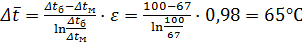 где ξ – потери в окружающую среду. В нашем случае, ξ =1, так как тепловые потери в окружающую среду отсутствуют. Средний температурный напор Среднелогарифмический напор для противоточной схемы движения теплоносителей: