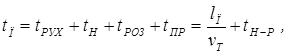 де tРУХ — тривалість рухові; tН — тривалість навантажування; tРОЗ — тривалість розвантаження; tПР — тривалість простою по організаційних причинах (оформлення документів і т.п.); lЇ — довжина їздки; vT — технічна швидкість; tH–P – тривалість навантажування й розвантажування. Проміжні заїзди для часткового довантаження або розвантаження не переривають циклу перевезення. Кожна нова їздка починається тільки з моменту подачі порожнього АТЗ. Його подача від місця стоянки й повернення після останнього пункту розвантаження ставиться не до окремого циклу перевезень, а до роботи АТЗ за день у цілому й називається нульовим пробігом. Сукупність елементів одного або декількох циклів перевезення з моменту подачі порожнього транспортного засобу в пункт навантаження до чергового повернення в цей же пункт утворить оборот автомобіля.