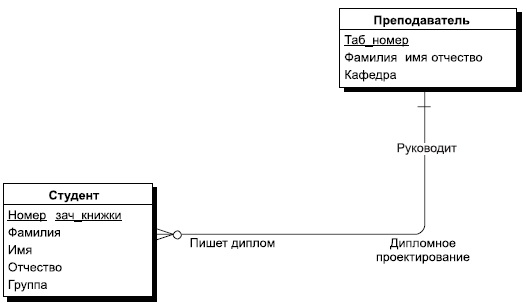 · Связь любого из этих типов может быть обязательной, если в данной связи должен участвовать каждый экземпляр сущности, необязательной — если не каждый экземпляр сущности должен участвовать в данной связи. При этом связь может быть обязательной с одной стороны и необязательной с другой стороны. Обязательность связи тоже по-разному обозначается в разных нотациях. Здесь необязательность связи обозначается пустым кружочком на конце связи, а обязательность перпендикулярной линией, перечеркивающей связь. И эта нотация имеет простую интерпретацию. Кружочек означает, что ни один экземпляр не может участвовать в этой связи. А перпендикуляр интерпретируется как то, что по крайней мере один экземпляр сущности участвует в этой связи. Рассмотрим для этого ранее приведенный пример связи " Дипломное проектирование". На нашем рисунке эта связь интерпретируется как необязательная с двух сторон. Но ведь на самом деле каждый студент, который пишет диплом, должен иметь своего руководителя дипломного проектирования, но, с другой стороны, не каждый преподаватель должен вести дипломное проектирование. ·