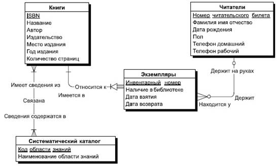 Инфологическая модель " Библиотека" разработана нами под те задачи, которые были перечислены ранее. В этих задачах мы не ставили условие хранения истории чтения книги, например, с целью поиска того, кто раньше держал книгу и мог нанести ей вред или забыть в ней случайно большую сумму денег. Если бы мы ставили перед собой задачу хранения и этой информации, то наша инфологическая модель была бы другой. Я оставлю эту задачу для вашего самостоятельного творчества.