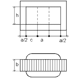 Рис. 1.1 Геометричні розміри мікротрансформатора броневої конструкції. Вважається, що задані: максимальна індукція в стрижні ВТ, частота fT, коефіцієнти заповнення площі: магнітопроводу - сталлю kст, вікна обмотки - міддю kм. Щоб формалізувати задачу визначення оптимальних геометричних розмірів трансформатора та їх співвідношень при заданій потужності Р2 і спаді напруги