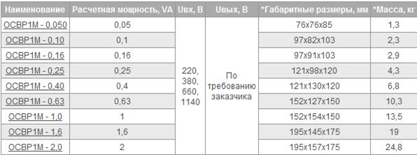 ОСВР1М Трансформатори серії ОСВР1М (однофазні, сухі, модернізовані, встановлювані в оболонки вибухозахищеного і гірського обладнання) призначені для живлення кіл керування гірського обладнання. Кліматичне виконання У категорія 3 по ГОСТ 15150. Трансформатори мають підвищену ізоляцію обмоток і підвищену стійкість до перенапруг мережі. Таблиця 2.2