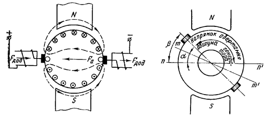 Ввімкнення обмотки додаткових полюсів послідовно з обмоткою якоря забезпечує необхідну комутацію в широкому діапазоні навантажень, так як в цьому випадку магнітні потоки додаткових полюсів Фдод і якоря Фа змінюються пропорційно струмові (осердя додаткових полюсів стають ненасиченими). В електричних машинах потужністю до 1 кВт, які найбільш широко використовуються в системах автоматики, встановлення додаткових полюсів недоцільне з двох причин: по-перше, це технологічно важко через малі розміри машин; по-друге, умови комутації в машинах такої потужності набагато легші. Тому в цих машинах магнітне поле в зоні комутації, необхідне для створення ЕРС обертання, що компенсує реактивну ЕРС, отримують, зміщуючи щітки з геометричної нейтралі nn¢ на кут b у напрямку обертання якоря в генераторах або проти обертання якоря в двигунах. Щітки слід зміщувати за фізичну нейтраль mm¢ (b > a) так, щоб індукція в зоні комутації мала напрямок і величину, при яких в комутуючих секціях наводилась ЕРС обертання, достатня для компенсації реактивної ЕРС (рис. рис.4.22).