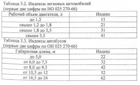 Легковые автомобили по конструкции кузова подразделяются на седаны, купе, универсалы, фастбеки. лимузины и другие Легковые автомобили различаются по величине рабочего объема двигателя, массе автомобиля и числу мест. При предельном между группами н классами рабочем объеме двигателя определяющей принимается сухая масса автомобиля. По виду перевозок легковые автомобили подразделяются на личные, служебные, такси и прокатные. В отечественном автомобилестроении используется классификация и система обозначения АТС, определяемые отраслевой нормалью ОН 025 270-66 Минавтопрома СССР.В соответствии с нормалью ОН 025 270-66 принята следующая система обозначения АТС: каждой новой модели автомобиля, прицепа и полуприцепа присваивается индекс, состоящий из ряда букв и цифр. Перед полным цифровым индексом ставится через дефис буквенное обозначение (марка) завода-изготовителя (аббревиатура или условное название, например: ГАЗ, ЗИЛ, КрАЗ, Урал, Москвич). Первая цифра обозначает класс АТС: по рабочему объему двигателя - для легкового автомобиля; по габаритной длине - для автобуса; по полной массе для грузового автомобиля. Вторая цифра указывает на тип АТС: легковой автомобиль обозначается цифрой 1 автобус - 2, грузовой автомобиль или пикап - 3, седельный тягач - 4, самосвал - 5, цистерна - 6, фургон - 7, цифра 8 - резерв, специальное АТС-9. Третья и четвертая цифры индексов указывают на порядковый номер модели, а пятая говорит о том, что это не базовая модель, а модификация. Шестая цифра обозначает вид исполнения: для холодного климата - 1, экспортное исполнение для умеренного климата - 6, экспортное исполнение для тропического климата - 7. Некоторые АТС имеют в своем обозначении через тире приставку 01, 02, 03, 04 и т.п., что указывает на то, что модель или модификация является переходной или имеет какие-то дополнительные комплектации. Две первые цифры индексов, присвоенных в соответствии с отраслевой нормалью легковым автомобилям, автобусам, грузовым (специализированным) автомобилям и прицепам (полуприцепам) приведены соответственно в табл.3.2, 3.3, 3.4.