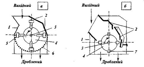 У молоткових дробарках (рис. 2.14 а) вихідний матеріал через завантажувальний отвір надходить у робочий простір, обмежений корпусом 1, який є захищеним броньовими плитами 2. Усередині робочого простору на горизонтальному валу 3 обертається ротор 4 з молотками 5, закріпленими шарнірно. Молотки вдаряють по грудках і з силою відкидають їх до стінок корпуса на плити, де грудки додроблюються.