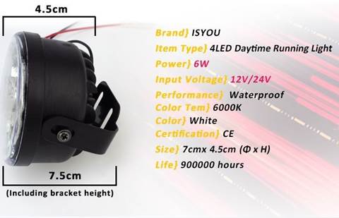 Спецификация: 1. Напряжение: 12 В/24 В 2. светлый цвет: ярко-белый 3. Количество ламп (в каждом): 4 4 Диаметр (приблизительно): 7 см (2.76 дюймов) 5. Свет толщина (приблизительно): 4.5 см 6. Весь Высота (приблизительно): 7.5 см (включая кронштейн Высота) Особенности: 1. Высокая мощность. Светодиодные фары дневного света, полный алюминиевый корпус для охлаждения. 2. Продуманный дизайн, хорошая структура, 100% водонепроницаемый, легкий монтаж, энергосбережения. 3. Стеклянные линзы для лучшей прозрачности и хороший световой рисунок.