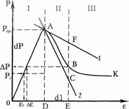 Інша картина руйнування спостерігається при випробуваннях зразків в режимі заданих деформацій. В цьому випадку випробувальна машина повинна бути сконструйована так, щоб була можливість задавати деформацію, що строго фіксується, з кроком)g і вимірювати відповідні їй зміни навантаження)Р. Характерний графік деформації зразка гірської породи ОАВ приведений на рис. 1. При деформації після досягнення межі міцності зразок знижує свій опір: на ділянці деформування DE опір зразка падає від точки А до точки В. Енергія, необхідна для деформування зразка на цій ділянці, рівна площі АВЕD. На початку розглядуваної ділянки (точка А) опір зразка і сила пресу були рівними між собою. При цьому напруженні частини пресу виявляються пружно деформованими.