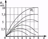 Енергія пружної деформації накопичується в колонах преса, в зігнутих траверсах, в стиснутому маслі гідроциліндрів. При зменшенні відстані між плитами пресу на величину DЕ створюване їм зусилля зменшиться на величину dР. При цьому, якщо прес недостатньо жорсткий, зусилля знизиться до точки F і потенційна енергія, що виділилася при цьому, рівна площі АFED, перевищить енергію, необхідну для руйнування зразка на ділянці DЕ. Надлишок енергії, рівний площі АFВ, піде на прискорення навантажуючих частин преса, процес руйнування стає некерованим і супроводжуватиметься динамічними явищами (ударом, розльотом осколків). Якщо ж прес має жорстку конструкцію і його елементи мало деформуються під навантаженням, то зменшення відстані між плитами викличе зниження зусилля преса до точки С, лежачої нижче характеристики зразка. Енергія АСЕD, що виділяється при цьому, менша необхідної енергії руйнування зразка і тому руйнування лише за рахунок енергії пружних деформацій пресу неможливе. Для переведення зразка із стану А в стан В необхідна додаткова енергія, яка рівна площі АВС, що підводиться ззовні, наприклад, шляхом підкачки масла в гідросистему пресу. Таким чином, для отримання позамежних характеристик породних зразків необхідно, щоб характеристика пресу була крутішою позамежної частини графіка деформації зразка. Крутизна характеристики називається жорсткістю пресу і визначається з виразу Q де Практика показує, що для отримання позамежних характеристик досить, щоб жорсткість пресу визначалась співвідношенням Q= 0 Рис.2.Можливі графіки деформування де F—площа поперечного перерізу зразка, см2. Характерні графіки позамежного деформування гірських порід приведені на рис.2. Крутизна позамежної частини графіка деформації показує схильність породи до крихкого руйнування. Аналогічно тому, як величина Е в пружній частині домежевої деформації називається модулем пружності, пропонується величину Для випробування гірських порід в режимі контрольованого руйнування в умовах об'ємного стиснення зразки випробовують в особливих приладах - стабілометрах, в яких робочим тілом, що створює бічне навантаження, служить рідина, наприклад, трансформаторне масло. Загальний вигляд графіка деформування мармуру в об’ємному напруженому стані приведено на рис. 3.
