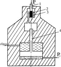 Рис.2. Прилад Кармана: 1—осьовий плунжер; 2—зразок гірської породи; 3—камера високого тиску; 4—плунжер гідрромультиплікатора