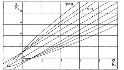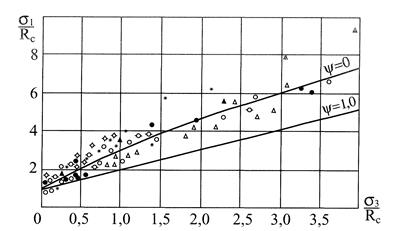 Незважаючи на деяке наявне розкидання експериментальних точок, неминуче при випробуваннях структурно неоднорідних матеріалів, якими є гірські породи і бетони, з малюнків випливає, що запропонована умова міцності (12) досить добре описує процес їхнього руйнування при об'ємному стисканні і стисканні з розтяганням. Із виразу (12) може бути отримана формула для приведення складного напруженого стану до простого одноосного. Вона має наступний вигляд: