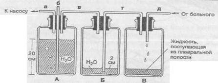 Торакоцентез. Дренаж по Бюлау (см билет1). При напряженном пневмотораксе прокол делают во втором или третьем межреберье по среднеключичной линии. Чтобы не повредить сосуды, игла должна пройти в центре межреберного промежутка. После стабилизации состояния сосудистый катетер заменяют на дренажную трубку, которую подсоединяют к вакуумной дренажной системе. При простом пневмотораксе пункцию проводят точно так же, но катетер сразу присоединяют к вакуумной дренажной системе. Можно использовать и пассивное дренирование с водяным затвором. Трехбаночная дренажная система. Бутыль А через трубку а подсоединяют к централизованной разводке вакуума, по трубке б в эту бутыль свободно поступает воздух. Величина отрицательного давления в бутыли А регулируется длиной подводной части трубки б (в данном случае 20 см). Таким образом, бутыль А служит для регулировки отрицательного Давления, которое по трубке в передается на бутыль Б и по трубке г — на бутыль В. Бутыль Б служит водяным затвором. Воздух может поступить в две из бутыли В по трубке г, только преодолев сопротивление двухсантиметрового столба жидкости. Бутыль В предназначена для сбора жидкости, отсасываемой из плевральной полости. Отрицательное давление, под действием которого в бутыль В по трубке д поступает жидкость из плевральной полости в данном случае составляет 18 см вод. ст. Такого давления обычно достаточно, чтобы обеспечить эффективное дренирование. Трехбаночная система позволяет поддерживать отрицательное давление в плевральной полости на постоянном уровне независимо от количества отделяемого по дренажу. Если по дренажу из плевральной полости отделяется воздух, в бутыли Б появляется пузыри.