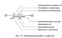 В качестве модели, отражающей технологические и организационные взаимосвязи процесса производства строительных работ в системах СПУ, используется сетевая модель. Сетевая модель изображается в виде графика, состоящего из стрелок и кружков. Сетевой график представляет собой сетевую модель с рассчитанными временными параметрами. В основе построения сети лежат понятия «работа» и «событие». Работа — это производственный процесс, требующий затрат времени и материальных ресурсов и приводящий к достижению определенных результатов Ожидание - процесс, требующий только затрат времени и не потребляющий никаких материальных ресурсов. Ожидание, в сущности, является технологическим или организационным перерывом между работами, непосредственно выполняемыми друг за другом.