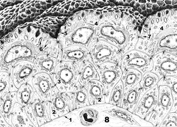 1. Базальная мембрана 2. Базальный слой эпителия 3. Промежуточный слой эпителия 4. Поверхностный слой эпителия 5. Пластинки плазмолеммы 6. Дисковидные пузырьки 7. Микрофиламенты 8. Подлежащая соединительная ткань