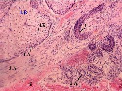 2. Простая разветвленная альвеолярная железа (кожа с волосом). Окраска гематоксилином и эозином. Увеличение 10х8; 10х40. На малом увеличении в области корня волоса найдите сальную железу. Выводной проток железы (2) открывается в волосяную воронку. Концевой отдел разветвлен (1). Он имеет вид нескольких мешочков. Переведите препарат на среднее увеличение и рассмотрите его. Найдите в концевом отделе периферический слой мелких базофильных клеток – базальный слой (4а), за которым следует несколько слоев больших прозрачных клеток – клетки, накапливающие жир (себоциты) – 4б. При слегка опущенном конденсоре видна ячеистая структура их цитоплазмы. Ближе к выводному протоку лежат разрушающиеся клетки (4в). Их ядра плотные, сморщенные или отсутствуют. Зарисовать и обозначить: 1) выводной проток; 2) альвеолярные концевые отделы и в них: а) базальный слой клеток, б) секреторные клетки себоциты, в) разрушающиеся себоциты.