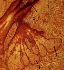 открывается в волосяную воронку (3) - место выхода волоса на поверхность кожи.