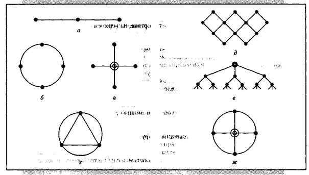 Рис. 3.6. Типы структур организаций: а – линейная, б – кольцевая, в – звездная, г – многосвязная, д – сотовая, е – пирамидальная, ж – комбинированная («колесом»)