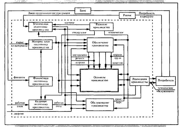 При линейной структуре каждый элемент системы (подразделение) связан с двумя смежными. Проходящие через систему командная информация и информация состояния становятся достоянием всей системы. Все связи здесь равноценны. Иерархические взаимоотношения отсутствуют. Выпадение любого элемента разрушает систему, ибо никаких других связей, кроме как с соседями, не предусмотрено. Кольцевая структура отличается от линейной лишь тем, что крайние элементы связываются друг с другом. Это дает возможность вести управление в двух противоположных направлениях и тем самым повысить его надежность. Иерархические взаимоотношения отсутствуют. Звездная структура представляет собой дальнейшее развитие кольцевой. Здесь появляется центральное подразделение, через которое информация может быстро коммутироваться в любое другое. Центральный элемент системы, как правило, является иерархически выше остальных. Многосвязная структура предполагает наличие связей каждого элемента системы с каждым. Как правило, связи равноценны и иерархия отсутствует. Такая система обеспечивает максимальную надежность передачи информации. Сотовая структура создается тогда, когда появляется необходимость канализации информации по ряду различных, связанных между собой направлений и сохранения при этом высокой надежности системы. Пирамидальная структура строится по иерархическому принципу: каждый вышестоящий элемент системы является старшим по отношению к нижестоящему. Такая структура имеет ряд уровней, причем чем уровень выше, тем больше у него подчиненных. Комбинированная структура представляет собой сочетание из двух или более структур со всеми их свойствами. Например, комбинация многосвязной и кольцевой структур дает структуру «колесо», в которой, с одной стороны, возможно равнозначное управление в обе стороны кольца, а с другой – появляется центральный элемент, обеспечивающий иерархию в системе. Любая структура может быть оценена с помощью следующих основных характеристик – объема, надежности, размещения, упорядоченности, централизации, оперативности. Объем структуры характеризует ее количественный состав: число уровней, элементов, связей между ними. Надежность структуры показывает ее живучесть, способность выполнять свои функции в различных условиях. Размещение структуры описывает положение ее элементов в пространстве и времени: соответствующее взаимосвязи, подчиненность, отведенные роли. Упорядоченность структуры показывает степень формализации ее построения и функционирования, возможности и механизмы изменения структуры. Централизация структуры говорит о распределении функций между центром и периферией системы и объемами соответствующих полномочий. Оперативность структуры означает возможность реакции системы на изменения обстановки, временные показатели этой реакции и ее цену. Типичным примером организации как сложной системы является производственно-экономическая система (ПЭС). Основным видом производственно-экономических систем является предприятие. Приведем, применительно к промышленному предприятию, некоторые необходимые сведения из теории сложных систем. Современное промышленное предприятие представляет собой единый производственно-хозяйственный комплекс, объединенный общей задачей – выпуском продукции 