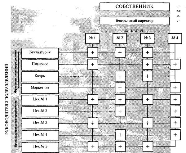 Главное достоинство данной схемы – целеустремленность на конечный результат и хорошая наглядность. Целевые структуры хорошо зарекомендовали себя при решении конкретных обособленных задач, например при создании новых товаров, обеспечении высокого качества продукции, завоевании новых рынков и т. д. Недостаток целевой структуры – ее уникальность, применимость лишь для одной глобальной цели. С появлением новой цели или с изменением старой эта структура должна быть коренным образом переработана. Матричная структура (рис. 5.3) представляет собой соединение элементов линейно-функциональной и целевой структур. Это наиболее современная схема, сочетающая в себе возможности того и другого вида управления. Здесь, применительно к каждой цели, определяется набор управленческих функциональных задач, решаемых с помощью как линейного, так и функционального управления, это сочетание показано крестиками, расположенными в местах пересечения горизонтальных и вертикальных рубрик матрицы.
