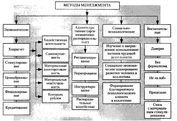 Если нужно повернуть автомобиль или пустить станок, требуемый результат получается достаточно просто: соответствующий силовой механизм, включенный рукой управляющего, заставляет машину выполнить приказ. Такой метод применим и при управлении людьми: нужно лишь отдать распоряжение и проверить, как оно выполняется. Многовековая история экономики показывает, однако, что при управлении человеком в процессе труда, в отличие от управления машиной, силовые методы не приводят к наилучшему конечному результату. Можно силой заставить работать и даже выполнить намеченный «урок» к сроку, но обязать работать по приказу эффективно, «на мировом уровне», невозможно, потому что это требует не только исполнительности, но и инициативы, постоянного совершенствования производства, а главное – внутренних побудительных мотивов. Именно этим объясняется то, что центральным вопросом экономической реформы в нашей стране явился переход от командно-нажимных к экономическим, рыночным методам управления. Переход к экономическим методам не означает их абсолютизации: наряду с ними продолжают существовать в новом качестве и другие известные методы управления, в том числе и административные. Совокупность современных методов управления и является тем средством, рычагом, с помощью которого можно добиться, чтобы каждый работающий на предприятии делал то, что нужно для достижения общей цели труда. Сегодня на первый план выходят экономические, социально-психологические и воспитательные методы менеджмента. Что касается методов административных, то они становятся вспомогательными, занимают подсобное место. Кратко остановимся на каждом из названных методов менеджмента (рис. 6.3).
