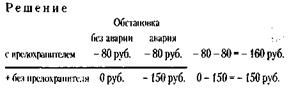 Показанная ситуация напоминает игру: у принимающего решение два хода (с предохранителем и без предохранителя); у вашего «противника» – обстановки – тоже два хода (без аварии и авария). Обстановка как бы противодействует, противится, не раскрывает своих «замыслов». И хотя точный ход «противника» неизвестен, можно определить, что будет, если... Рекомендация в данной задаче весьма проста: нужно сложить цифры материального ущерба для каждого из возможных решений (это показано справа) и принять то из них, где сумма ущерба меньше. Решение в рассмотренном случае – оснастить прибор предохранителем (оно помечено крестиком). В данной задаче ярко проявился неотвратимый характер риска: уклониться от решения в рискованной ситуации невозможно. Хотя ситуация весьма неопределенная (то ли будет авария, то ли нет), решение требуется вполне определенное: или с предохранителем, или без него. Третьего не дано. Продолжая рассмотрение задачи, отметим, что решение меняется на противоположное, если стоимость предохранителя оказывается больше половины стоимости ремонта. Скажем, 80 рублей. Вот и соответствующее соотношение: