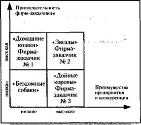 Позиции каждой фирмы в системе прямоугольных координат получают следующую интерпретацию (см. рис. 14.3). В соответствии с упомянутым выше методом анализа фирмы, оказавшиеся в левой верхней четверти оцениваются как «Домашние кошки» (они как бы просятся в дом), в верхней правой – «Звезды» (т. е. весьма привлекательные), в нижней левой – «Бездомные собаки» (их выгоняют на улицу), в нижней правой – «Дойные коровы» (их прибыль используют). В нашем примере фирма № 1 может быть оценена как «Домашняя кошка», № 2 – как «Звезда», № 3 – как «Дойная корова» (см. рис. 14.3).