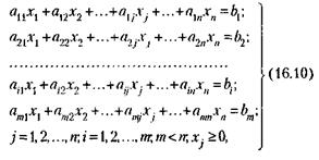 где сj – постоянные коэффициенты (коэффициенты стоимости). Условия задачи (ограничения) могут быть заданы также в виде неравенств. В этих случаях можно привести систему линейных ограничений к виду (16.10), вводя в каждое линейное ограничение дополнительные неотрицательные неизвестные: