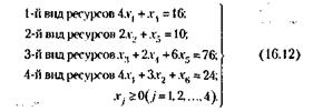 Смысл первого уравнения в нашем примере в том, что ресурс вида 1, общий ресурс которого составляет 16 единиц, может размещаться в количестве четырех единиц на предприятии первого типа и одной единицы – на предприятии четвертого типа. Аналогично раскрывается смысл второго и последующих уравнений. Последнее условие говорит о том, что число предприятий не может быть отрицательным. Необходимо определить, какое количество предприятий каждого типа следует иметь, чтобы общие издержки были минимальными. В соответствии с табл. 16.1 целевая функция, подлежащая оптимизации, примет вид: