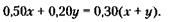 255. Обозначим через х искомое количество граммов компонента коктейля с 50 % спирта, а через у – с 20 % спирта. Тогда условие задачи можно записать в виде следующего уравнения:
