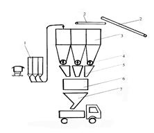 Одноступенчатая схема производства товарного бетона и раствора: 1 – склад цемента, 2 – система ленточных транспортеров для подачи инертных материалов, 3 – расходные бункера, 4 – дозаторы, 5 – загрузочные воронки, 6 – бетоносмеситель, 7 – бункер-накопитель