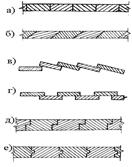 Сплачивание деревянных элементов: а – впритык; б – «в ножовку»; в – внахлестку; г – вразбежку; д – в четверть; е – в шпунт; ж – в двухсторонний паз со сквозной рейкой; з – сплачивание бревен и брусьев: 1 – нагель (шкант); 2– врубка сопряжения (паз) В углах бревна для ряжей или стен соединяют врубками: “в обло”, или “в лапу без остатка”.