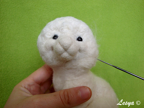 Небольшими облачками шерсти обваливаем в месте стыка носика с головой, чтобы не было видно стыка.