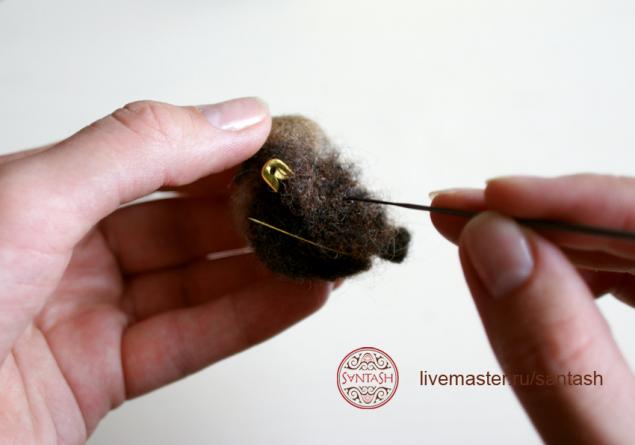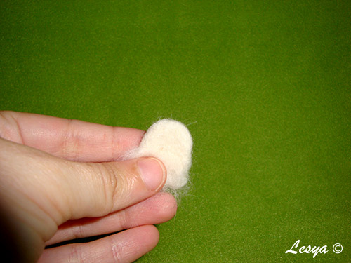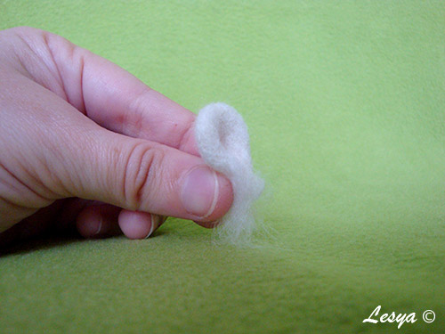 Затем, когда ушко совсем уже плотное, с одной стороны приваливаем распушенный, разорванный в руках белый кусочек шерсти тонкой иглой.
