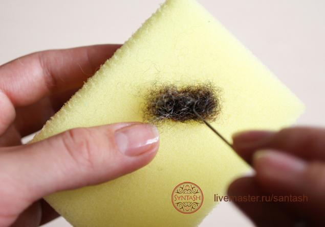 17. Теперь на выпуклую часть мордочки укладываем горизонтально достаточно толстую прядь шерсти и приваливаем ее по середине. Это будет наша борода.