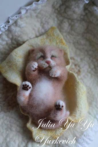 На этом этапе можно оставить вашего котика гладким, но тогда поверхность должна быть ровной, хорошо «выглаженной», т.е.не иметь рытвин, а быть однородной.Этого можно добиться при помощи тонкой иглы(№40).Но, если вы хотите, чтобы ваш малыш стал мохнатеньким, тогда надо взять иглу с обратным ходом и постепенно двигаясь «омохнатить»всю игрушку.Я использую сразу две иглы, зажимая их между пальцами, для ускорения процесса.Для большей аккуратности можно потом воспользоваться ножницами и подстричь пряди