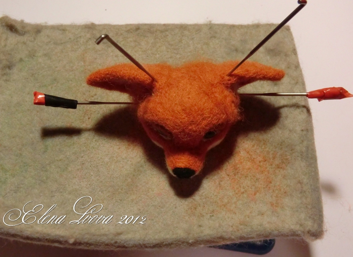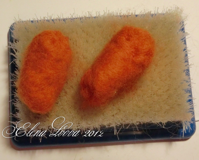 12. Нашей распрекрасной рыженькой головушке не хватает рыженьких ушек. Валяем ушки: Берем два одинаковых комочка шерсти, загибаем их в форме ушек и валяем на щетке несколькими иглами, периодически переворачивая и тыкая с другой стороны. Не забываем аккуратно по краям валять тонкой иглой, чтобы и края у нас свалялись и тем самым можно поправлять форму ушка.