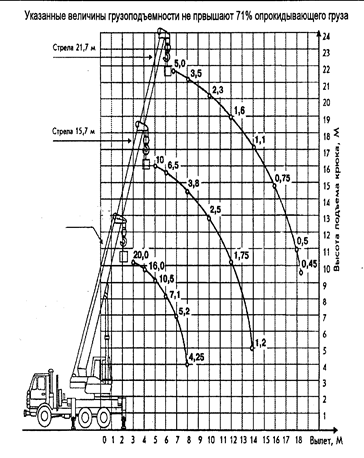 наоборот. Такая же связь между вылетом стрелы и грузоподъемностью: чем больше вылет стрелы, тем меньше грузоподъемность. Зависимость высоты подъема крюка и его грузоподъемности от вылета стрелы выражается кривой, называемой грузовысотной характеристикой крана (ГВХ), прилагаемой к технической документации каждого крана. (См. Рис.2.4.).