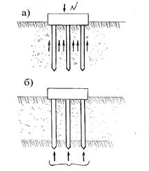 Рис. 6.1. Сваи, отличающиеся по способу передачи нагрузки на грунт: а – висячие сваи, б – сваи-стойки