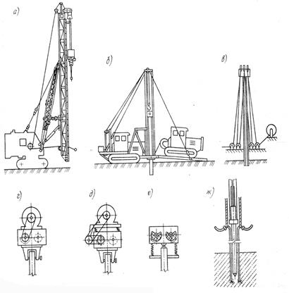 Рис. 6.2. Оборудование для погружения свай: а - сваебойное оборудование на базе экскаватора; б – установка для вдавливания свай; в – то же, с помощью лебедки; г- низкочастотный вибропогружатель; д – то же, высокочастотный; е – вибромолот;