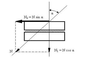При производстве каменной кладки особое значение имеет порядок расположения камней, от которого зависят устойчивость и прочность каменного сооружения. Камни и раствор должны работать как монолитный массив, способный сопротивляться действующим на него усилиям. Порядок расположения камней называется разрезкой кладки. Правила разрезки кладки должны обеспечить монолитность кладки и способность сооружения воспринимать нагрузки. Существует три основных правила разрезки. Первое правило разрезки устанавливает, что ряды камней в кладке необходимо располагать параллельно друг другу и перпендикулярно действующей нагрузке. Постели камней должны опираться на нижележащий ряд по всей своей плоскости. Горизонтальный шов между рядами должен быть полностью заполнен раствором во избежание концентрации напряжений, возникающих при передаче усилий не по всей поверхности камня, а в отдельных точках. При действии нагрузки под углом к плоскости рядов в кладке возникают сдвигающие усилия, которые могут вызвать ее разрушение. Однако в ряде случаев, например, при кладке опор сводов, подпорных стен, приходится допускать наклонное действие нагрузки. Но при этом угол наклона действующей силы не должен превышать определенной величины. Если направление действующей силы N (рис. 7.2) образует угол a с перпендикуляром на плоскость постели, то кроме нормальной составляющей силы N 1 = N сosa, сжимающей кладку, действует усилие N2 = N sina, стремящееся сдвинуть камень в горизонтально направлении. Во избежание сдвига верхнего камня требуется, чтобы сдвигающая сила N 2 была меньше силы трения P = fN Cosa, (где f – коэффициент трения). Это означает, что N sina £ fN cosa. Тогда, разделив обе части уравнения на N cosa, получим, что tga = f. Поскольку f = tgj, где j - угол трения, то tga = tgj, и соответственно a = j. Угол трения для кирпича по раствору равен 30-35 град. Для необходимого запаса прочности (как правило, равного 2), угол допускается не более половины угла трения, т.е. должен быть меньше 15-17 град.