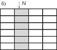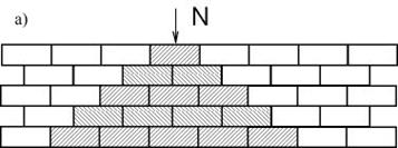 Рис. 7.2. Воздействие наклонной силы на каменную кладку Второе правило предполагает следующее: расположение камней в кладке должно быть таким, чтобы исключалась возможность их сдвига или скола под влиянием действующих на кладку сил. Для этого все боковые плоскости соприкасающихся камней (вертикальные швы) должны быть перпендикулярны постели. При этом поперечные швы должны быть перпендикулярны наружной поверхности кладки, а продольные швы – параллельны ей. В случае образования наклонных к постели плоскостей клинообразные камни под действием усилий, возникающих в кладке, могут раздвинуть соседние камни, а неперпендикулярные плоскости к наружным поверхностям кладки создадут условия для выпадения отдельных камней. Третье правило определяет взаимное расположение вертикальных продольных и поперечных швов в смежных рядах кладки. Для создания монолитности каменной кладки камни вышележащего ряда необходимо укладывать на нижележащий ряд так, чтобы они перекрывали вертикальные швы между камнями в продольном и перечном направлениях. Такая перевязка швов позволяет исключить в кладке отдельно стоящих столбов на всю высоту кладки, воспринимающих усилия самостоятельно и потому склонных к разрушению от потери устойчивости и расслоения. (рис. 7.3). При такой системе кладки воздействующие усилия N передаются всей кладке, и устраняется опасность ее расслоения. Прочность кладки, выполненной с соблюдением всех правил разрезки, зависит от прочности камней и раствора, системы перевязки, а также толщины и плотности швов.