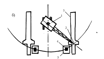 Рис. 9.9. Схема подъема колонны в вертикальное положение: а – способом поворота, б – способом скольжения; 1 – монтажный кран; 2 – точка строповки колонны; 3 – колонна;