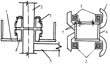 При захватах может быть местная или дистанционная расстроповка; последняя освобождает монтажника от непроизводительных переходов и подъемов для расстроповки. Захваты могут быть оборудованы ручным или механическим (электромеханическим, электромагнитным, пневматически) приводом. Для временного закрепления и выверки деталей применяют клинья, расчалки, кондукторы и струбцины. С помощью клиньев и расчалок монтируют небольшие (массой до 2 т и высотой до 4 м) колонны. Клинья изготовляют из древесины твердых пород (дуба, бука), бетона и стали. Их применяют на монтаже железобетонных конструкций. Монтаж металлических конструкций ведут с помощью металлических клиньев. Использование деревянных клиньев на монтаже железобетонных конструкций затрудняет их извлечение после заделки стыков. Оставлять в стыках можно только бетонные и металлические клинья, но это невыгодно. В подобных случаях лучше пользоваться инвентарными клиновыми вкладышами, которые легко можно удалять, к тому же ими можно пользоваться при установке колонн, если стыки имеют различные размеры. По каждой грани колонн при ее ширине до 400 мм устанавливают один вкладыш, при большей ширине колонны – два вкладыша. После достижения бетоном стыка 70% проектной прочности вкладыши извлекают. Применение вкладышей вместо клиньев позволяет сократить время работы крана примерно на 15%. Для выверки и временного закрепления колонн в стаканах применяют кондукторы. Кондукторы Проектстальконструкции сравнительно просты в изготовлении, но позволяют только частично механизировать процесс выверки колонны при свободном способе монтажа. Кондуктор ЦНИИОМТП позволяет автоматизировать процесс выверки колонн при принудительном методе ее установки в стакан фундамента. Имеются кондукторы для монтажа колонн в стаканы фундамента и на нижележащую колонну. Одиночные кондукторы (рис. 9.15) предназначены для одновременного монтажа одной колонны, групповые – для одновременного монтажа нескольких колонн. В любом случае кондуктор состоит из устройства для закрепления кондуктора на фундаменте, нижележащей колонне или перекрытии (хомуты, струбцины, тяги), устройства для временного закрепления монтируемой колонны (обычно – разъемные хомуты), устройства для перемещения колонны вдоль осей здания и настилов (стационарных или откидных) для размещения монтажников и сварщиков, соединенных при необходимости лестницами – если кондукторы многоярусные.