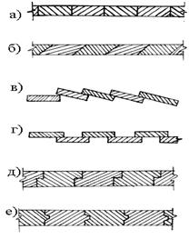 Рис. 10.1. Сплачивание деревянных элементов: а – впритык; б – «в ножовку»; в – внахлестку; г – вразбежку; д – в четверть; е – в шпунт; ж – в двухсторонний паз со сквозной рейкой; з – сплачивание бревен и брусьев: 1 – нагель (шкант);