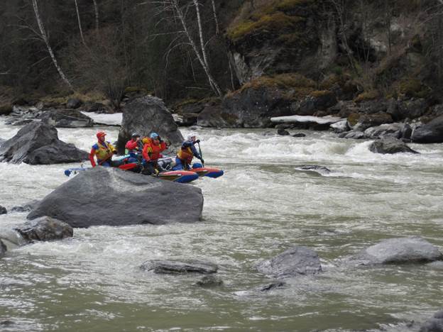 В результате прохождение на К4 было совершено вполне успешно, правда попадания в прижим избежать не удалось, но к скале катамаран был повернут носом (преднамеренно) и после столкновения со скалой катамаран слился по струе. Вывод – нужно было брать еще левее и не допускать попадания в косую бочку, уж очень она сильно и далеко отбрасывает судно в скалу